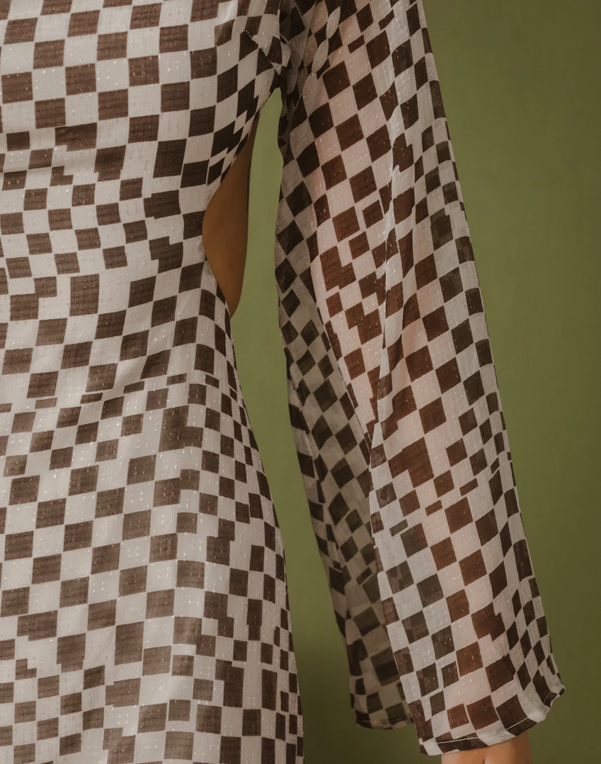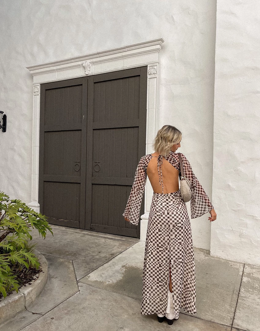 Beige and brown checkered maxi dress
