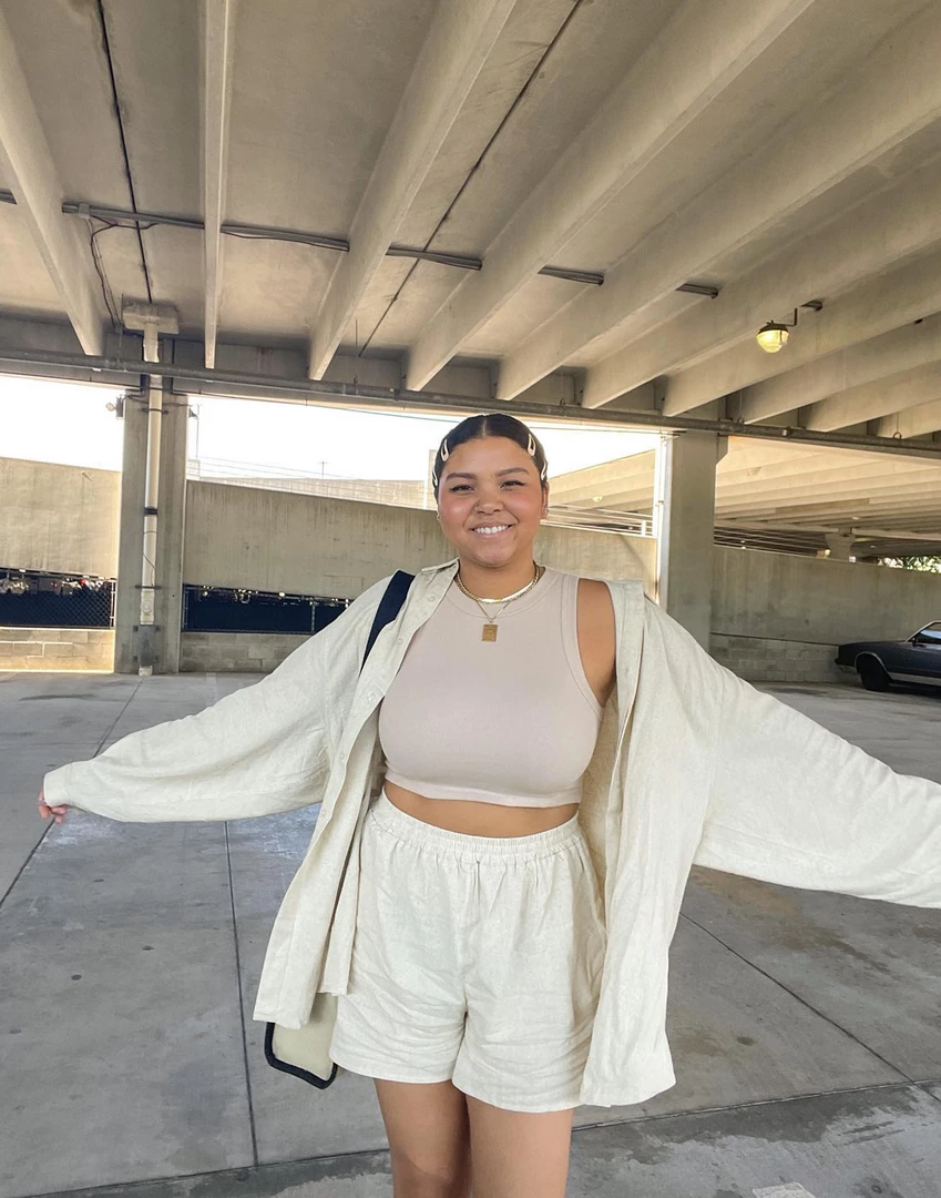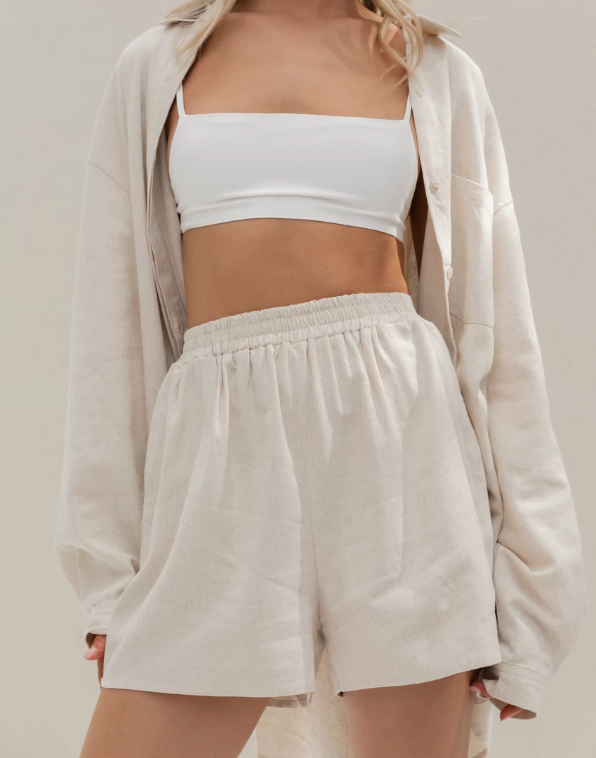 @amyy.dotti wears a size AUS 6 in this style, paired with the South Beach Shirt (Linen) & the Cairo Crop Top (Beige).