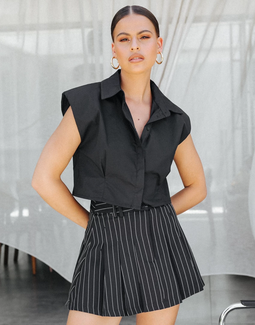 Black and white pin stripe high waisted mini skirt