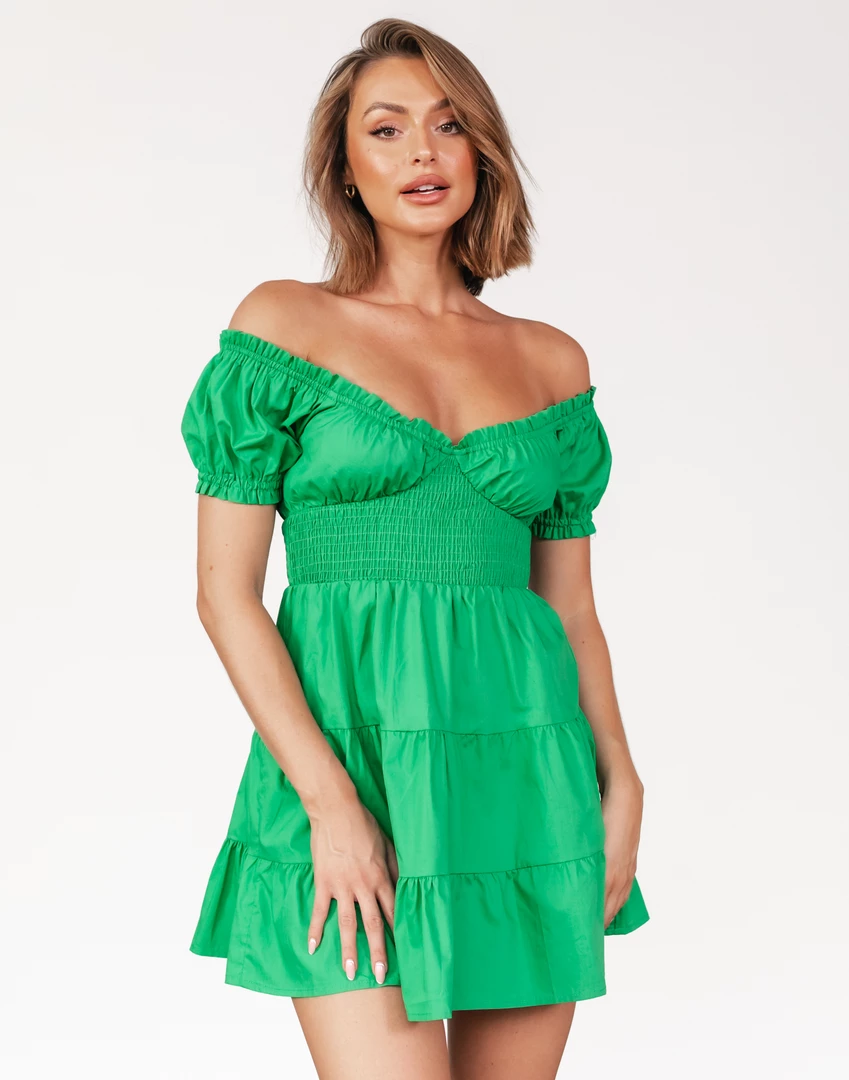 SKU: dress-6692838834278 Categories: Bold in colour, Clothing, Dresses, Edit, Mini Dresses, Summer Edit Tags: AP2499, Dress, Flowy, Green dress, Green mini, Mini, Off shoulder, Summer