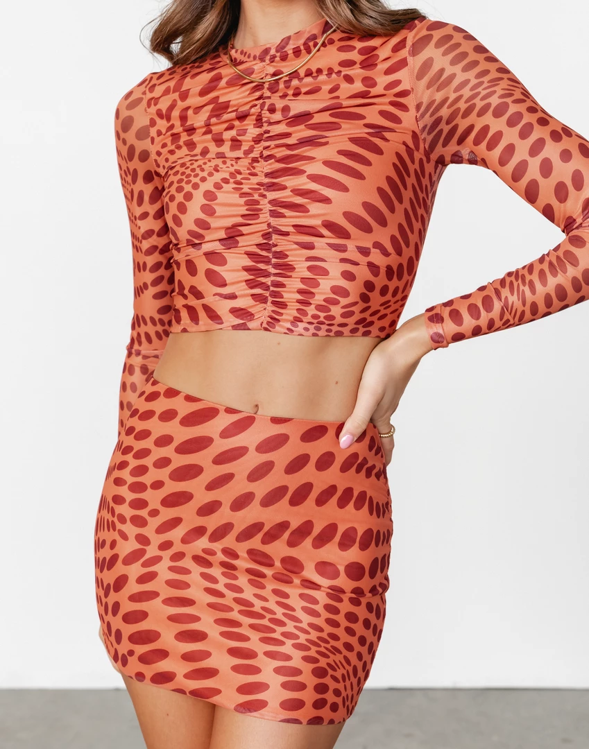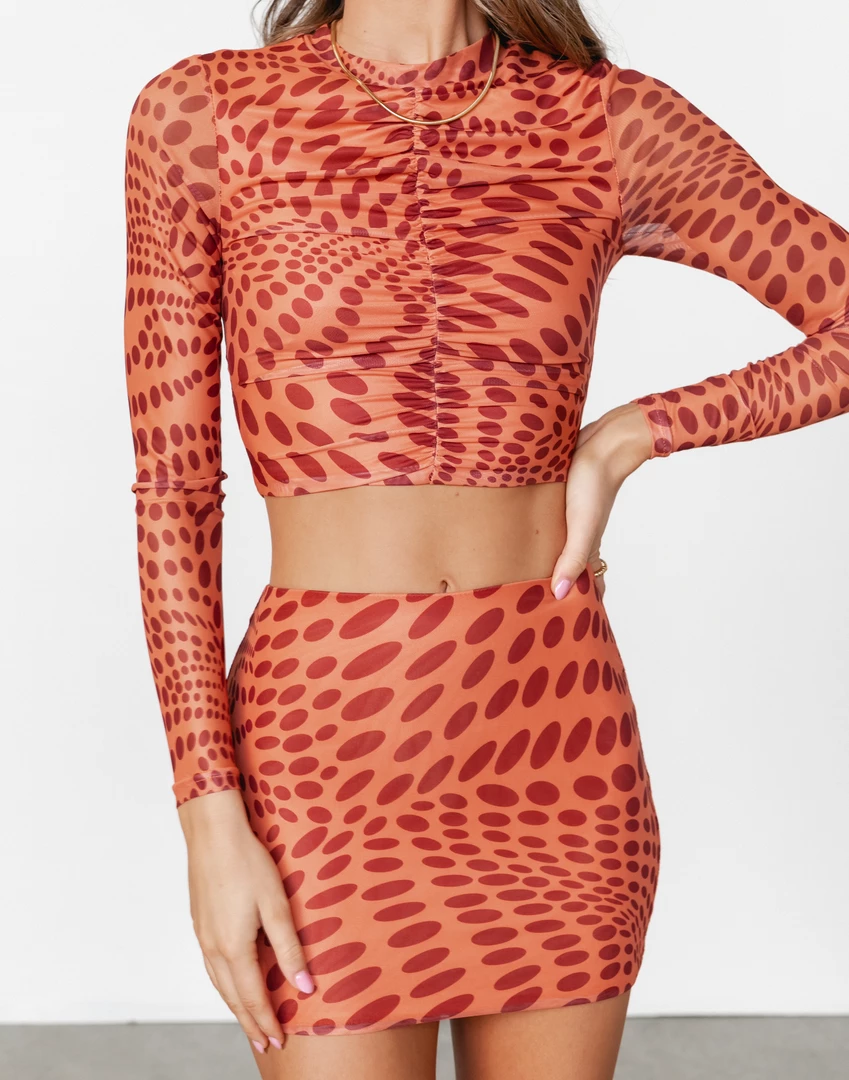 SKU: top-6714887536742 Categories: Bold in colour, Clothing, Edit, Going out, New Arrivals, Sets + Co-ords, Tops, Winter Warmers Tags: _matching-set:sunny-set-orange-red, Long sleeve top, Mesh set, Orange set, Party, Pattern, Red lon sleeve, Red long sleeve