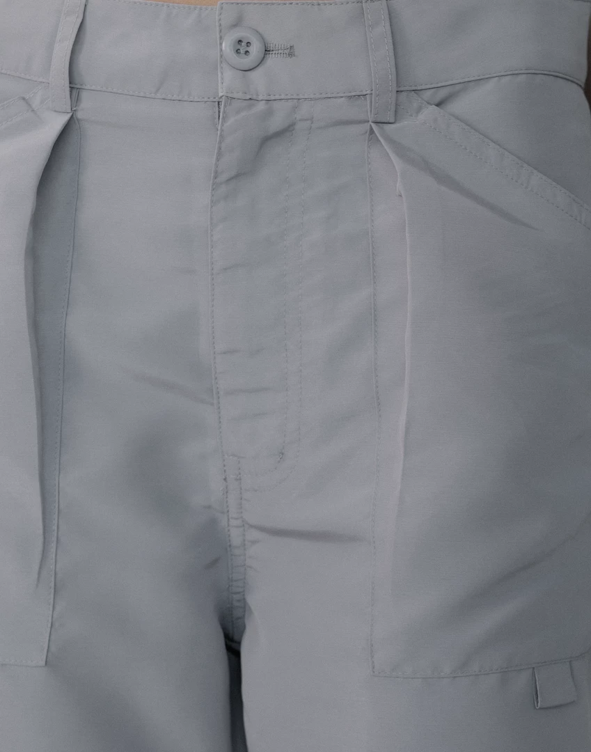 Tucked detailing along the inner seam at knees