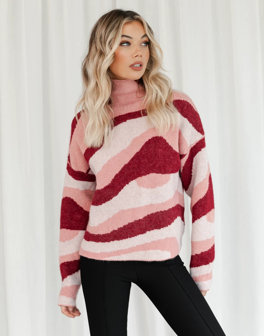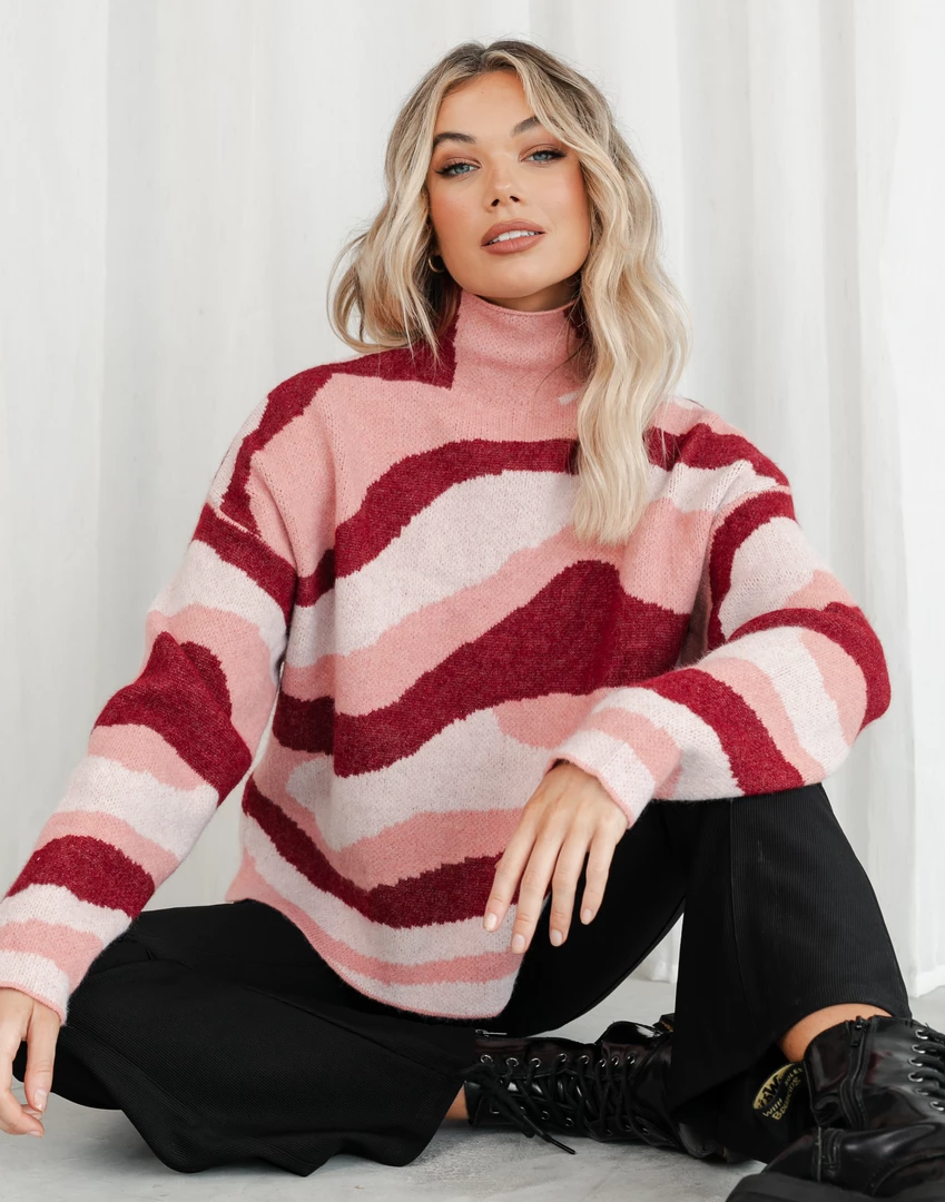 SKU: top-6720973045862 Categories: Bold in colour, Clothing, Edit, Jackets + Outerwear, Jumpers & Cardigans, Jumpers + Cardigans, Knitwear, New Arrivals, Tops, Winter Warmers Tags: Bright colour, Emma, Knit jumper, New arrivals, Pattern top, Patterned jumper, Pink knit, Red knit