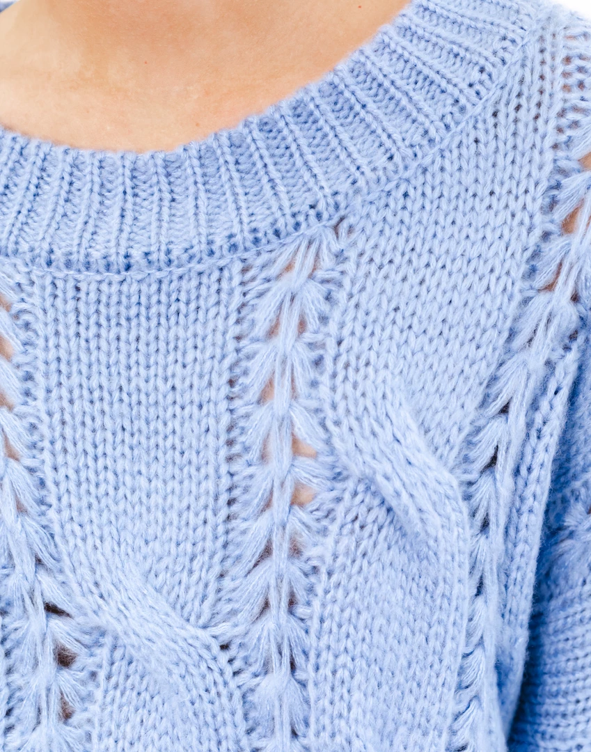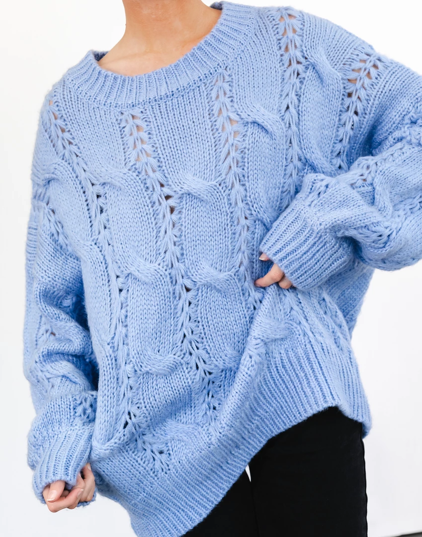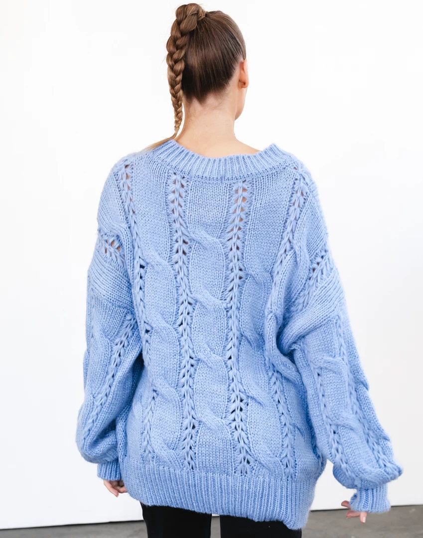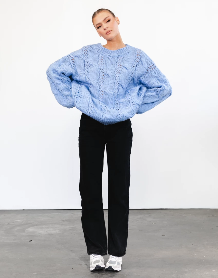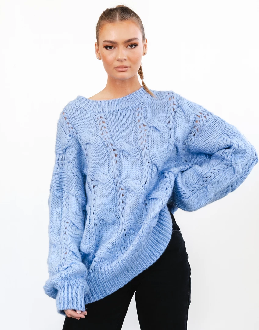 SKU: top-6731926012006 Categories: Clothing, Edit, Jackets + Outerwear, Jumpers & Cardigans, Jumpers + Cardigans, Knitwear, New Arrivals, Tops, Winter Warmers Tags: Blue jumper, Internationalsizeguide, Knitted jumper, Light Blue, Long Sleeve, Long sleeve knit, Pull over, Winter