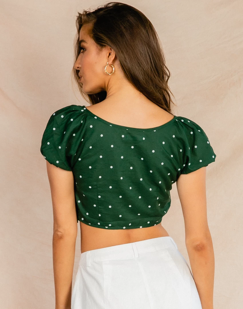 Green and white polka dot crop top