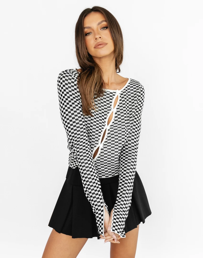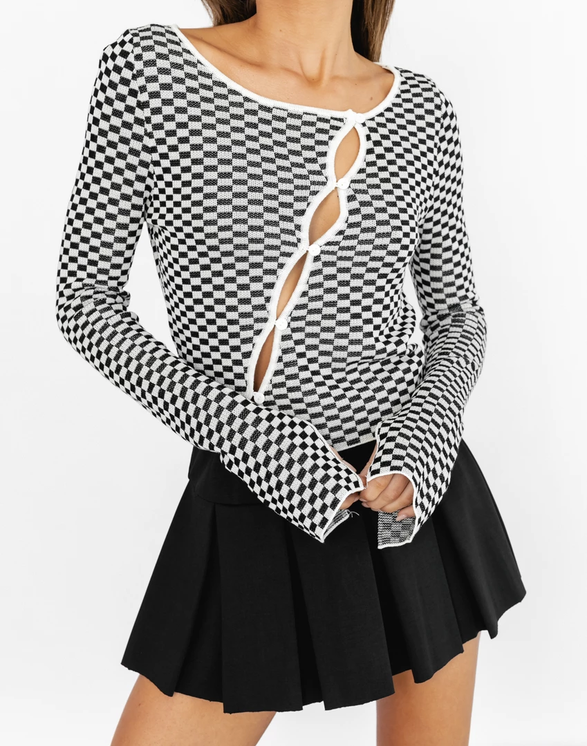 SKU: top-6740325400678 Categories: Clothing, Crop Tops, New Arrivals, Tops Tags: Button up detailing, Buttons, Checked, Checkerd print, Crop, Cropped fit, Diagonal button up, White